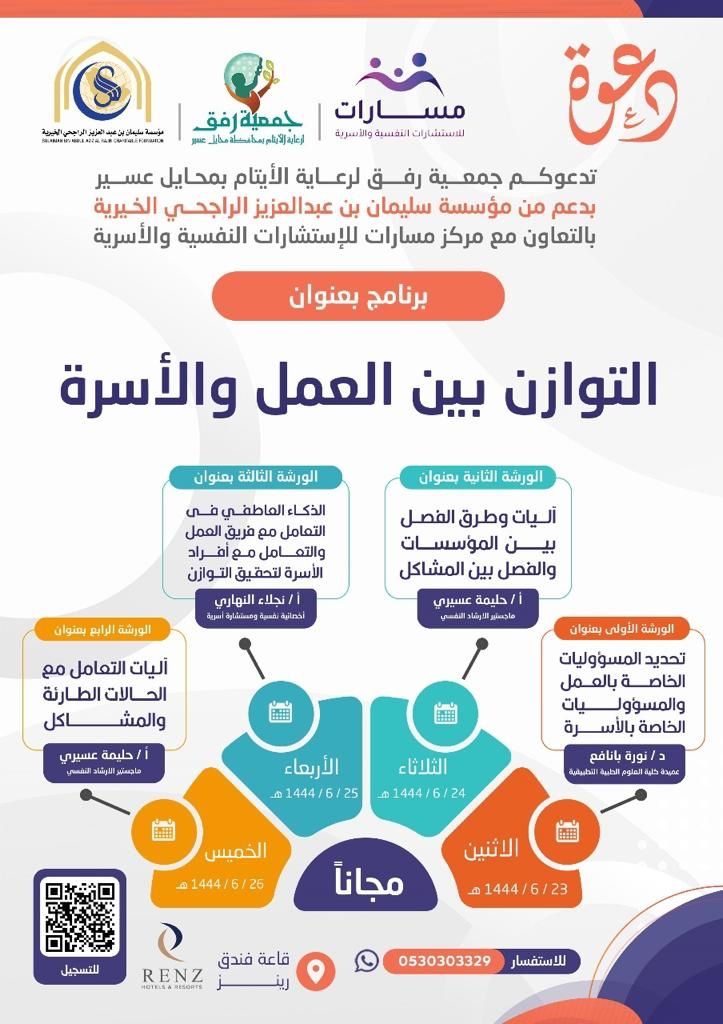 في إطار الشراكة والتعاون بين جمعية رفق للأيتام ومركز مسارات للإرشاد الأسري والنفسي و بدعم من مؤسسة الشيخ سليمان بن عبدالعزيز الراجحي الخيرية تم تقديم برنامج التوازن بين العمل والأسرة لأمهات الأيتام وعلى مدى أربعة أيام متتالية .