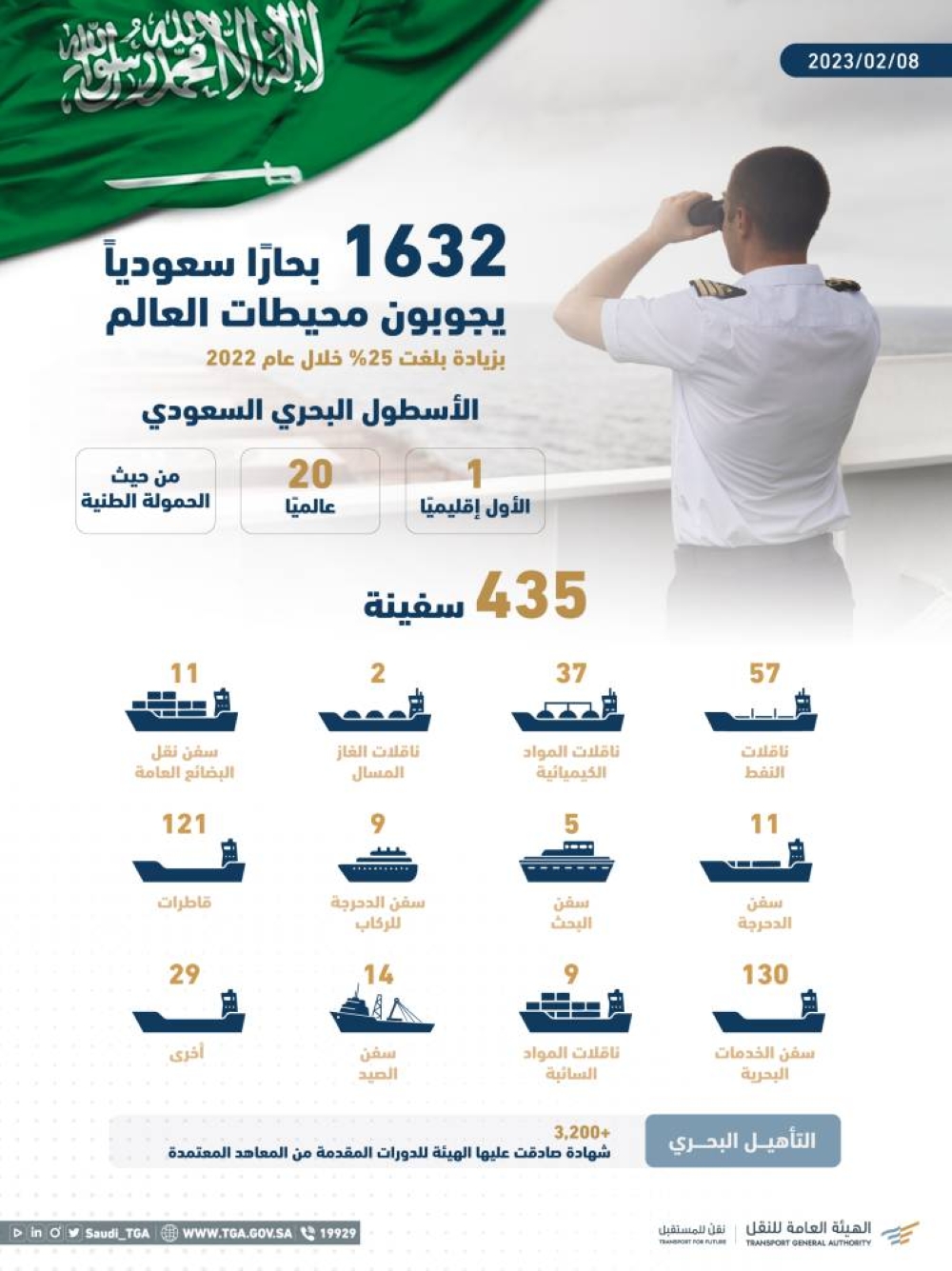 وأشارت الهيئة إلى أن البحارة السعوديين وبمختلف وظائفهم النوعية كبحار تقنيات إلكترونية، وربان، وضابط السطح، والضابط الأول، والضابط المهندس، وكبير المهندسين، وعامل راديو لأغراض النظام العالمي للاستغاثة والسلامة البحرية (نظام GMDSS)، وبحار، وضابط أمن سفينة، وملاح متمرس للمحركات، وملاح متمرس للسطح، يمتلكون الكفاءة والقدرات العالية والتي أسهمت في تقدم وتطور الأسطول البحري السعودي، حيث بلغ إجمالي الحمولة الطنية للأسطول خلال العام الماضي 2022م أكثر من 14,6 مليون طن، كما بلغ إجمالي السفن الوطنية التي تحمل العلم السعودي (435) سفينة .