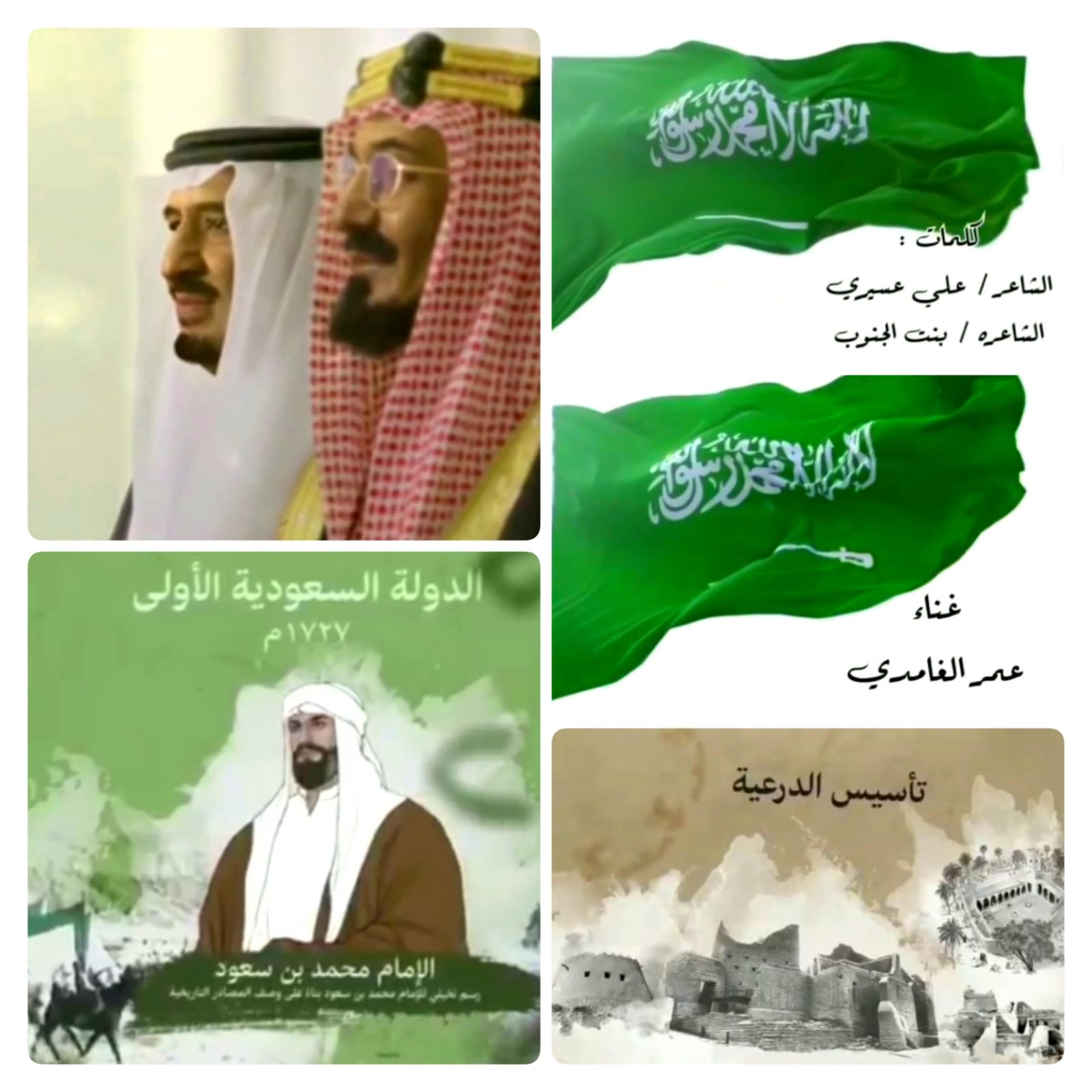 يتغنى كل عشاق مملكتنا الحبيبة باسم الوطن الغالي (المملكة العربية السعودية)، وخاصة في المناسبات الوطنية وعلى وجه التحديد يوم التأسيس السعودي ( من يوم بدينا ) فقد تألق الشاعر الإعلامي علي عسيري والشاعرة بنت الجنوب في التغزل بحب الوطن وقادته وإنجازاته عبر رؤية المملكة العربية السعودية 2030 بكلمات تداعب احاسيس المواطنين السعوديين فخراً وعزاً بهذا اليوم المجيد (يوم التأسيس) وقد تغنى بها أيضاً الفنان عمر الغامدي تحت عنوان “يوم الوطن”.