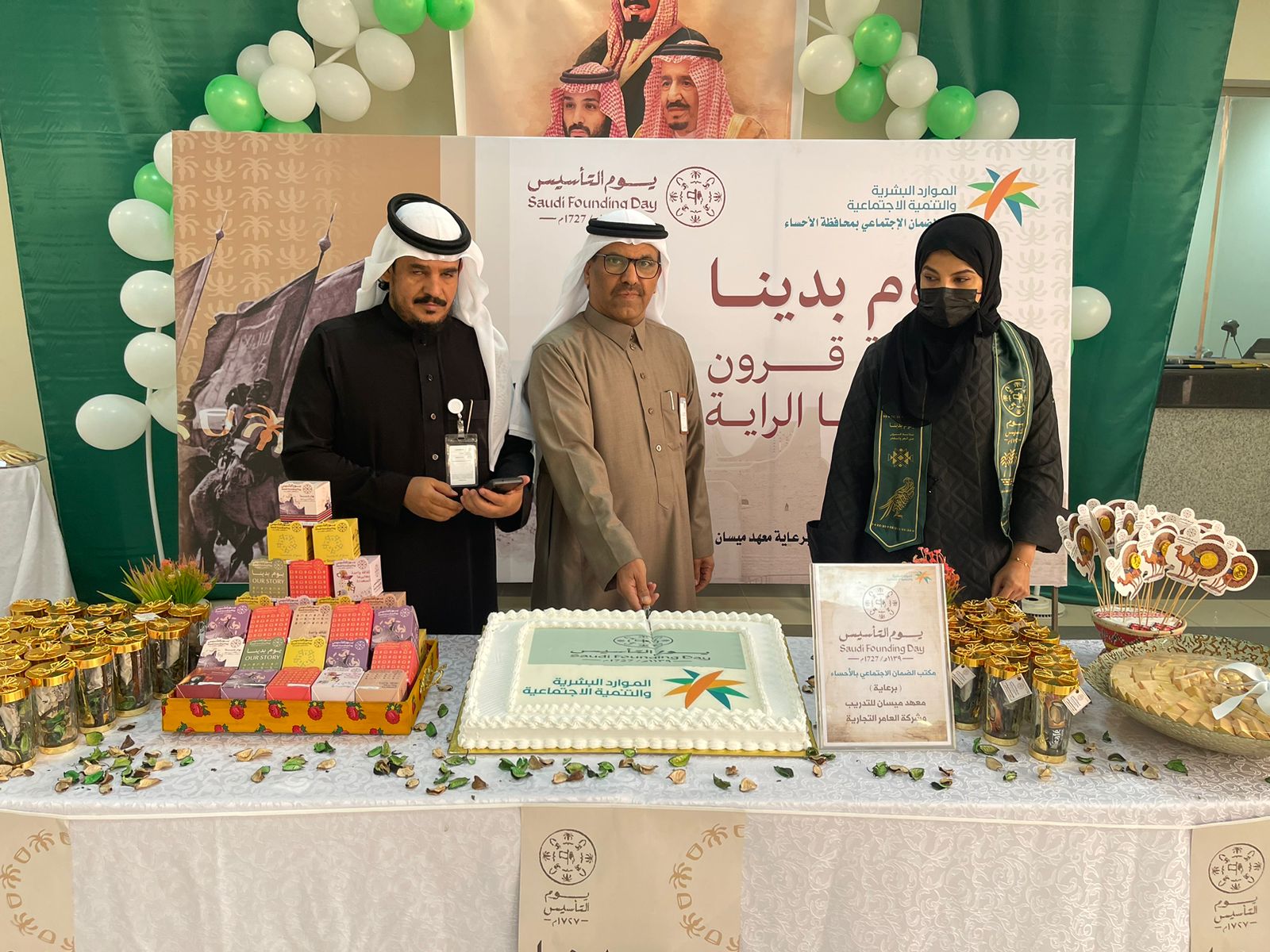 أقام مكتب الضمان الاجتماعي بالأحساء ممثلاً بقسم التمكين اليوم الأثنين١٤٤٤/٨/١-٢٠٢٣/٢/٢١م احتفالاً بذكرى يوم التأسيس السعودي بحضور مدير المكتب الأستاذ/ مقيم بن فهيد القحطاني ومساعدته الأستاذة/ نورة بنت عبدالرحمن آل الشيخ مبارك