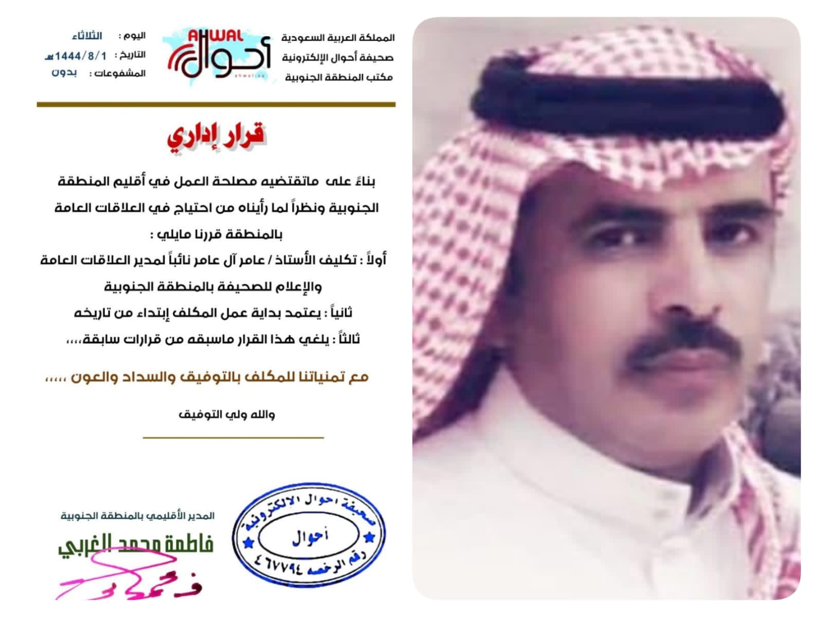 أصدر المدير الإقليمي لصحيفة أحوال الإلكترونية بالمنطقة الجنوبية الأستاذة فاطمة محمد الغربي مساء الإثنين قراراً يقضي بتكليف الأستاذ عامر آل عامر نائبًأ لمدير العلاقات العامة والإعلام بالمنطقة الجنوبية.