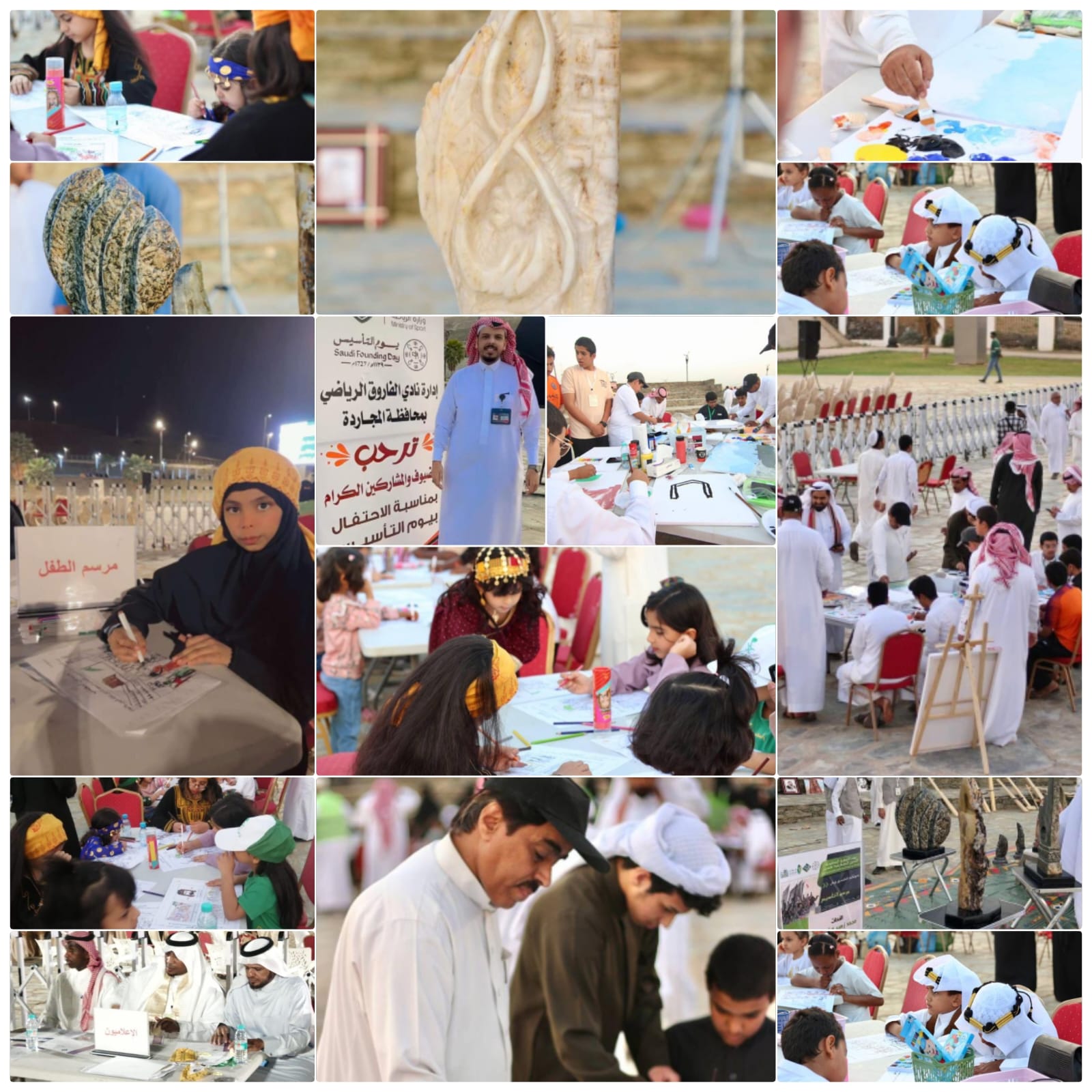 بمناسبة يوم التأسيس السعودي أقامت الجمعية السعودية للفنون التشكيلية (جسفت) بعسير برعاية جمعية التنمية الأهلية بالمجاردة، وبلدية محافظة المجاردة، ورش “مرسم التأسيس” بمحافظة المجاردة بمشاركة نخبة من فناني عسير وفناناتها يوم الثلاثاء الماضي في حديقة السلام،التحق فيها عدد من المتدربين والمتدربات تعرفوا خلالها على التصوير التشكيلي والطرق المثلى للتعبير باللون بحضور عدد من الممارسين والمهتمين بالفنون البصرية، وخلال فقرات المرسم أقيم معرض النحت الأول للنحاتين علي أحمد المشيخي، ومحمد زهير الشهري، والذي اشتمل على عدد من المنحوتات الحجرية المأخوذة من طبيعة محافظة المجاردة.