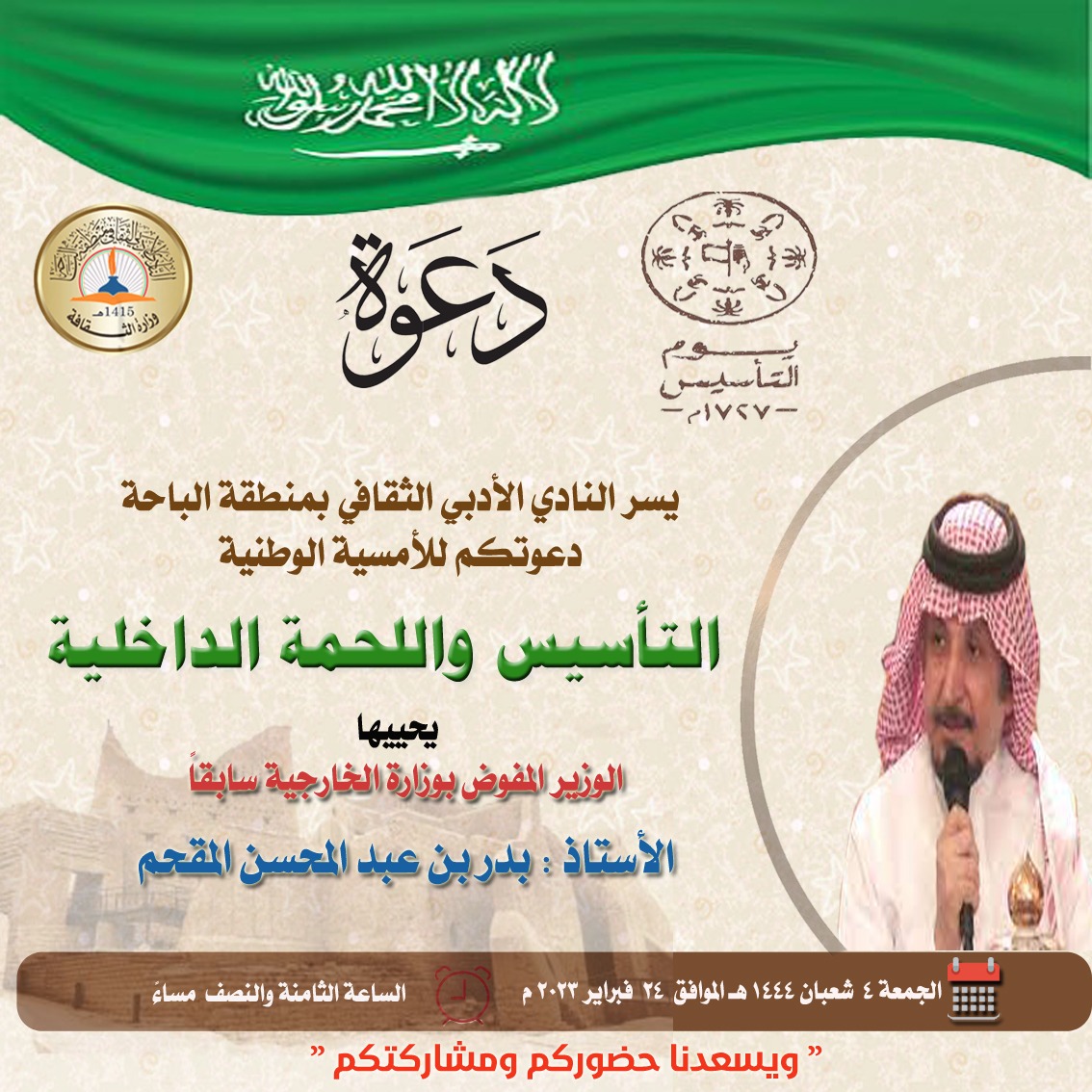 يقيم النادي الأدبي الثقافي بمنطقة الباحة يوم الجمعة الموافق 1444/8/4 ، أمسية وطنية بعنوان : ( التأسيس واللُحمة الداخلية ) يقدمها الوزير المفوض بوزارة الخارجية سابقًا : بدر بن عبدالمحسن المقحم ، وذلك بالتزامن مع فعاليات يوم التأسيس ، والذي يُقام هذا العام بشعار “ يوم بدينا .. ثلاثة قرون من رفعنا الراية “.