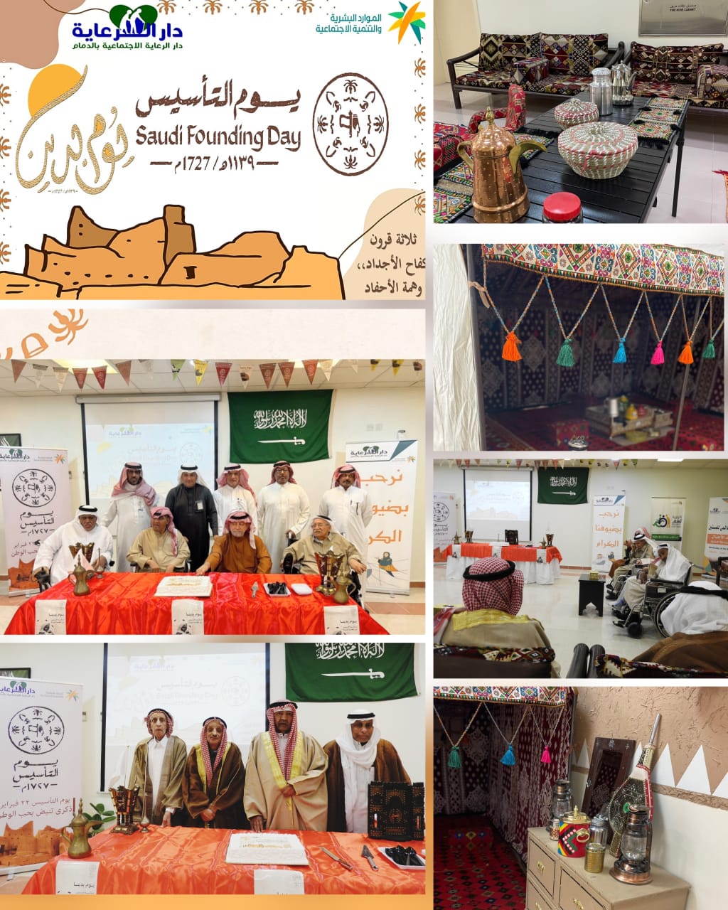 أقامت دار الرعاية الإجتماعية بالدمام التابعة لفرع وزارة الموارد البشرية والتنمية الاجتماعية بالمنطقة الشرقية حزمة من البرامج والفعاليات والتي تضمنت مشاركة متنوعة في الاحتفالات بمناسبة يوم التأسيس ” ثلاثة قرون من رفعنا الراية “حيث شارك الآباء يوم الأربعاء 22 فبراير فعاليات أمانة المنطقة الشرقية بالشراكة مع فرع وزارة الموارد بالمنطقة الشرقية” بيوم التأسيس التي احتضنتها” تكية بحر” بكورنيش الدمام. فقد استمتع الآباء بالأوبريت الخاص وكذلك العرضة السعودية وتم أخذهم بجولة حول أركان المهرجان المتنوعة.