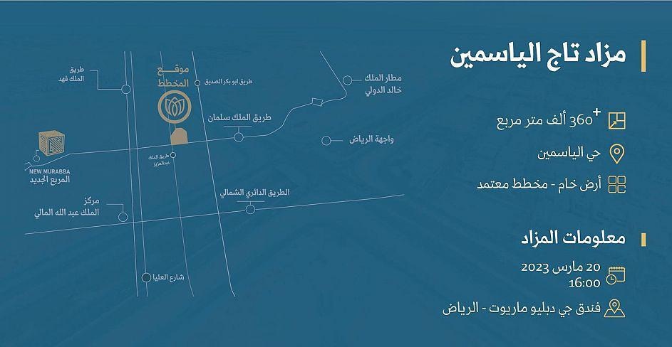 ويعرض المزاد أرض خام سكنية تجارية ضمن مخطط معتمد من أمانة الرياض؛ والتي يتجاوز إجمالي مساحاتها 360 ألف متر مربع بموقع استثنائي بمدينة الرياض؛ حيث تقع على أهم الطرق الحيوية تحديدا على تقاطع طريق الملك سلمان وطريق الملك عبدالعزيز، وتبعد عن طريق الملك فهد وعن طريق أنس بن مالك 2 كم، وأبرز المعالم المحيطة بالأرض هو مشروع المربع الجديد داون تاون الرياض وجامعة الأميرة نورة إذ يبعد 7 كم عن الأرض، وعن مشروع واجهة الرياض ومركز الملك عبد الله المالي تقريبا 8 كم، كما يبعد عن مطار الملك خالد الدولي بـ 13 كم.