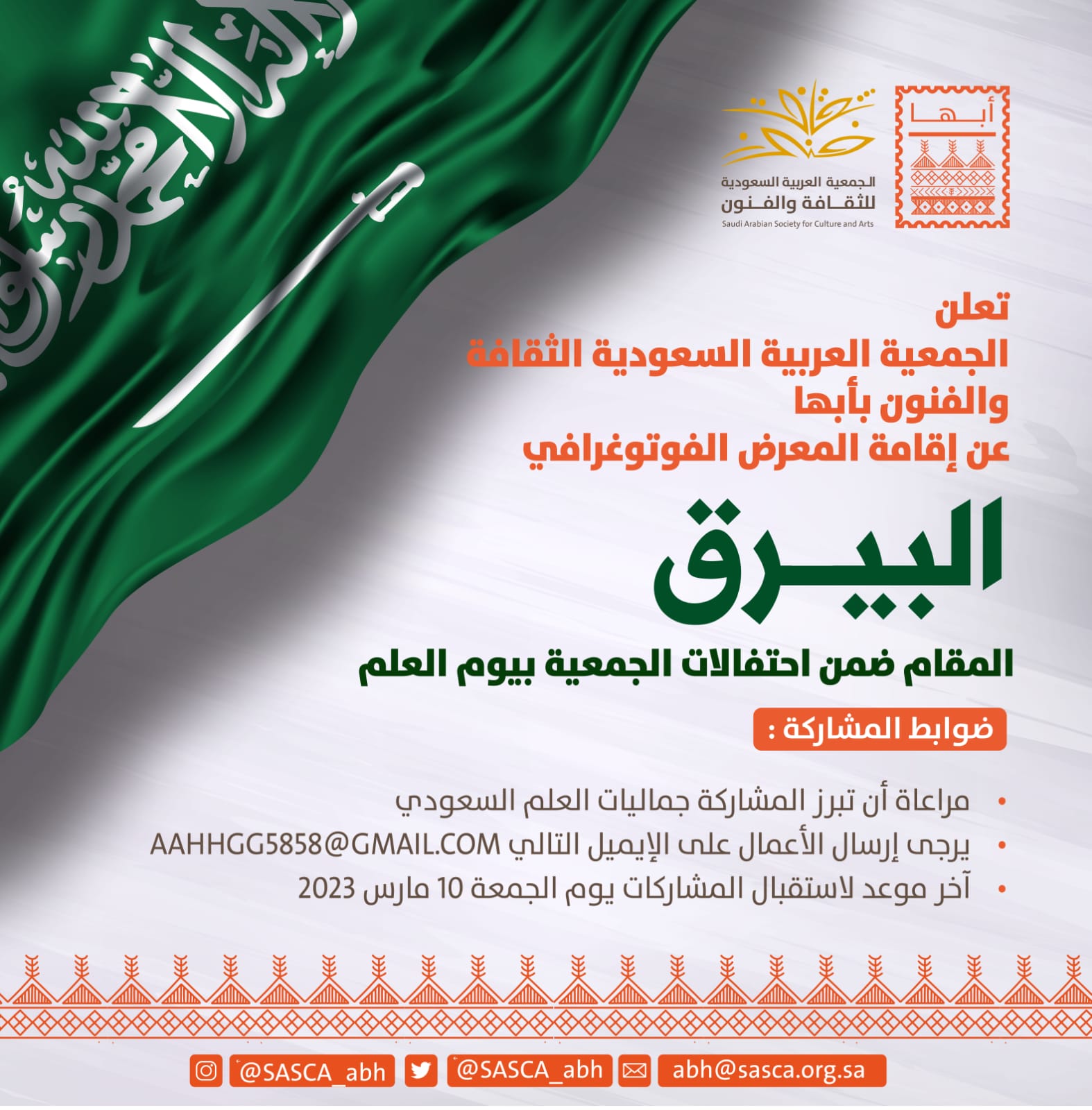 تقدم جمعية الثقافة والفنون بأبها مساء الأحد المقبل معرض البيرق الفوتوغرافي ضمن احتفالاتها بيوم العلم الموافق ١١ مارس.