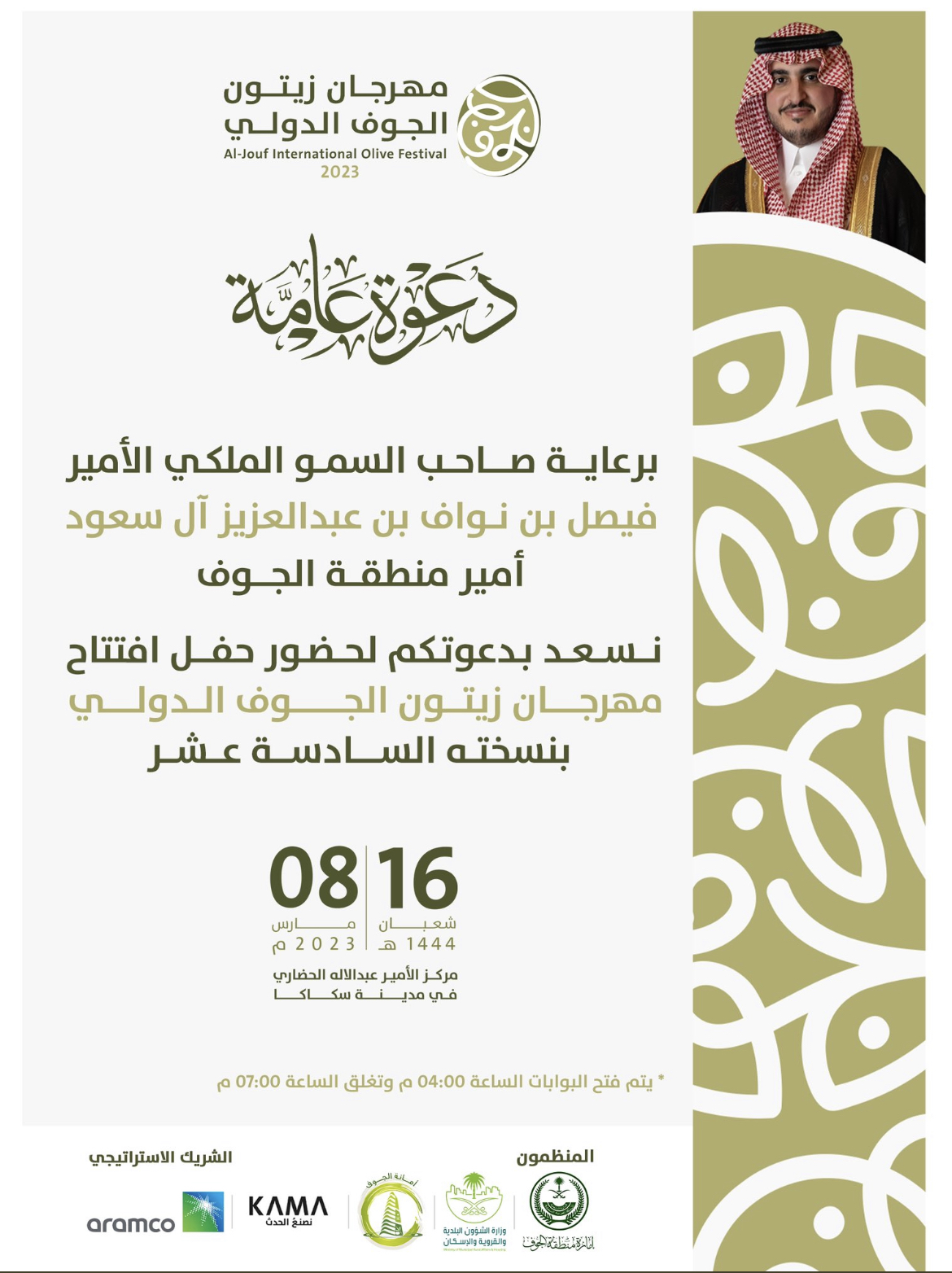 يدشّن صاحب السمو الملكي الأمير فيصل بن نواف بن عبدالعزيز أمير منطقة الجوف اليوم الأربعاء، مهرجان زيتون الجوف الدولي في نسخته السادسة عشرة ، الذي تنظمه أمانة المنطقة لمدة 10 أيام في مركز الأمير عبدالإله الحضاري بمدينة سكاكا، وسيتم في ختام المهرجان تتويج الفائزين بجائزة سمو الأمير فيصل بن نواف بن عبد العزيز لأفضل إنتاج من المزارعين للزيت والزيتون والصناعات التحويلية للزيتون التي تبلغ قيمتها الإجمالية 500 ألف ريال.