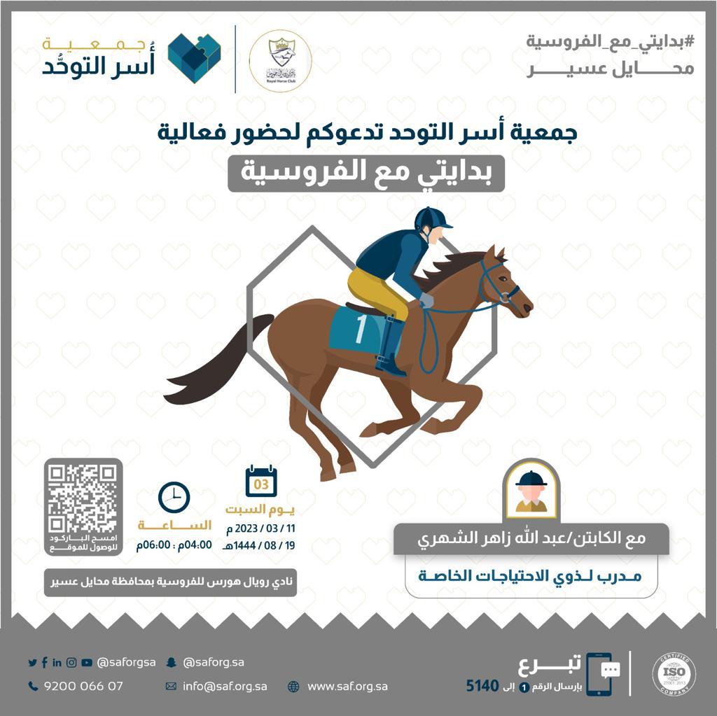 مع بداية انطلاق الاحتفال بيوم العلم أقامت جمعية أسر التوحد مساء اليوم برنامج (بدايتي مع الفروسية) مع الكابتن عبدالله زاهر الشهري مدرب لذوي الإحتياجات الخاصة والذي أقيم بنادي رويال هورس للفروسية بمحايل عسير ،