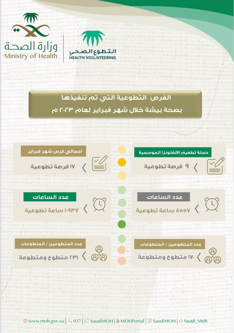 قالت صحة بيشة أنه تم تنفيذ حوالي 11 ألف ساعة تطوعية خلال شهر فبراير الماضي في عدد 17 فرصة تطوعية.