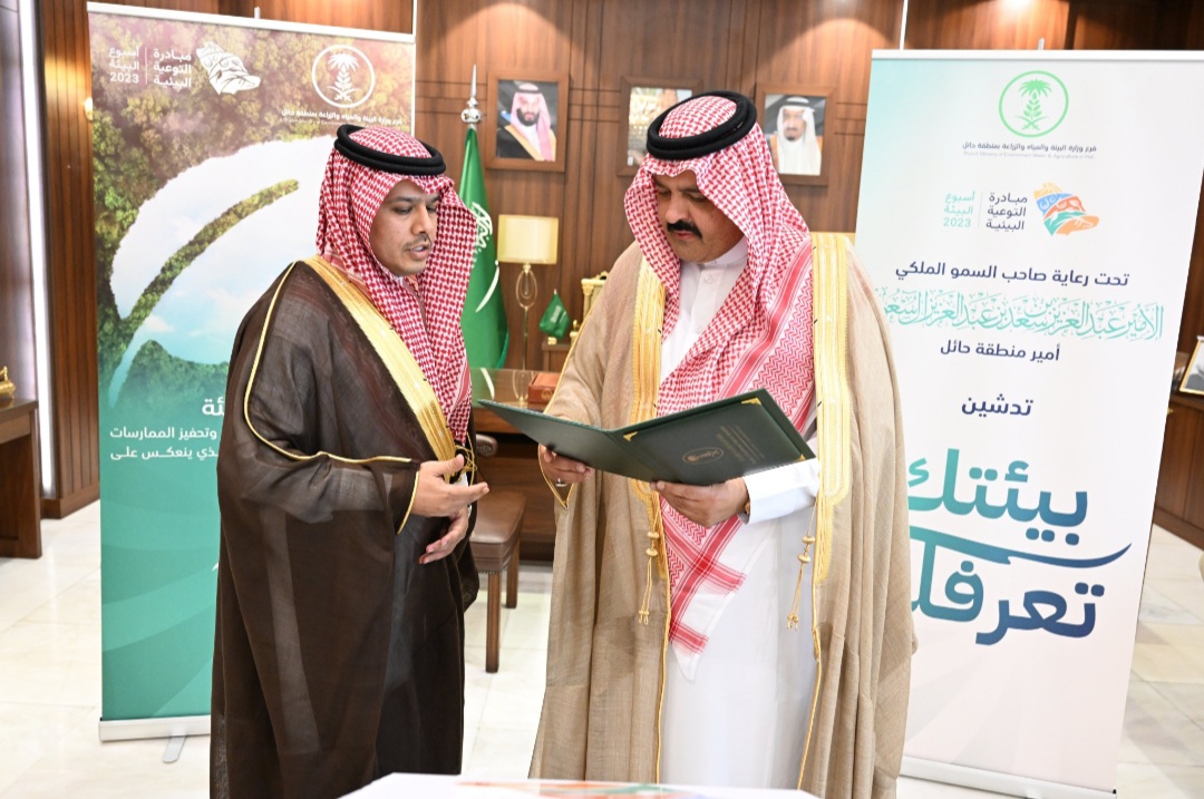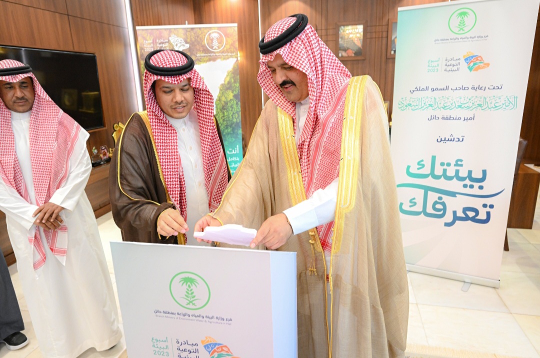 دشّن صاحب السمو الملكي الأمير عبدالعزيز بن سعد بن عبد العزيز أمير منطقة حائل في مكتبه اليوم ، فعاليات أسبوع البيئة بالمنطقة تحت شعار ” بيئتك تعرفك ” التي تستمر لمدة أسبوع وتشمل تنفيذ بعض البرامج التوعوية البيئية في مواقع متعددة بالمنطقة ، بالإضافة إلى برامج لدعم التشجير ونظافة المتنزهات والأودية ، وذلك بحضور مدير عام فرع وزارة البيئة والمياه والزراعة بالمنطقة الدكتور فهد الحسني ونائبه.