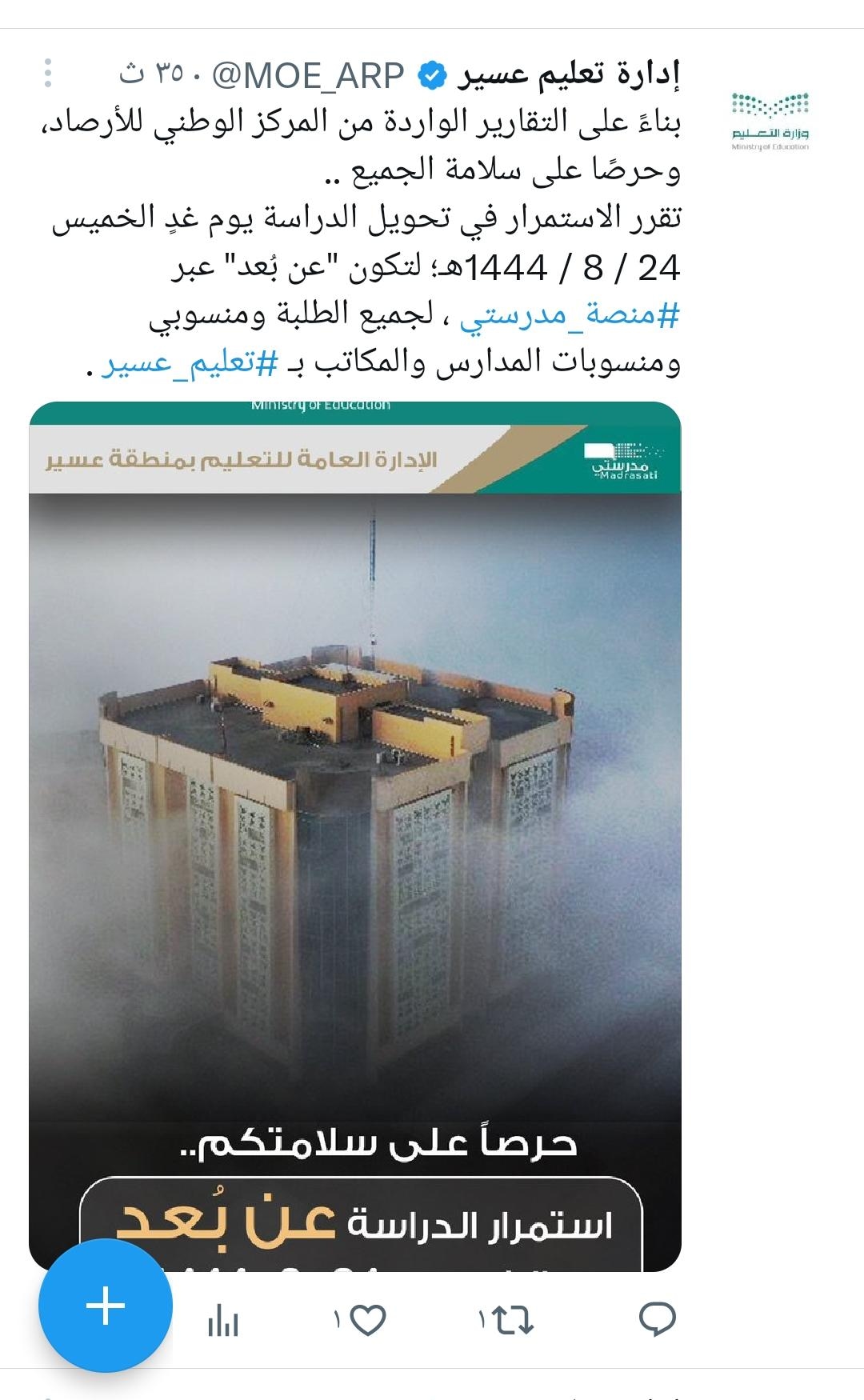 مدير عام التعليم بمنطقة عسير يوجه بتعليق الدراسة الحضورية غداً الخميس ٢٤ شعبان لليوم الرابع على التوالي بسبب الأمطار والأحوال الجوية حيث أن منطقة عسير تشهد امطار غزيرة في المنطقة والمحافظات التابعة لمنطقة عسير جعلها الله أمطار خير وبركة وعم بها جميع بلاد المسلمين