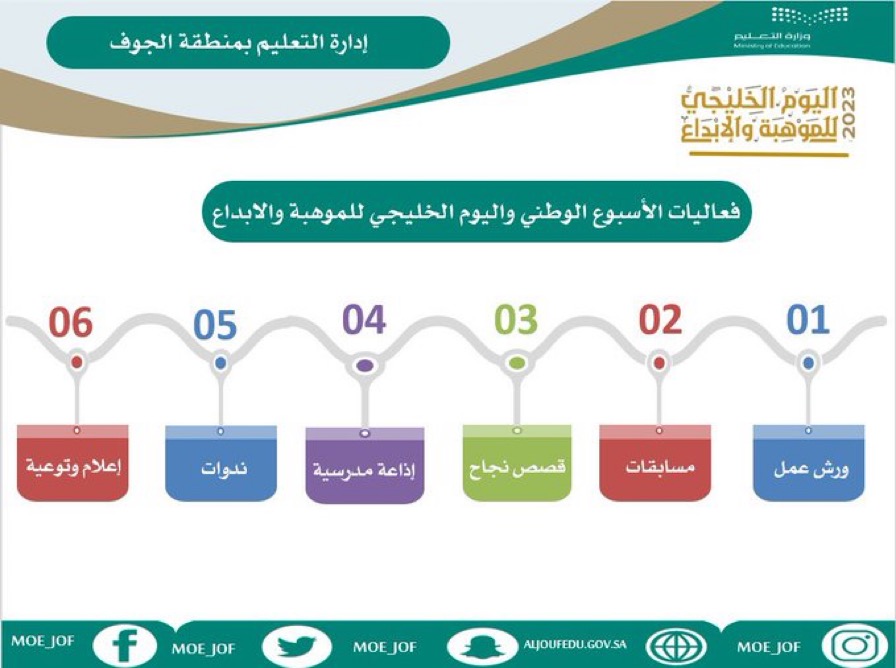 أطلقت الإدارة العامة للتعليم بمنطقة الجوف ممثلة بإدارتي الموهوبين والموهوبات الأسبوع الوطني للموهبة والإبداع، وذلك تزامناً مع اليوم الخليجي للموهبة.