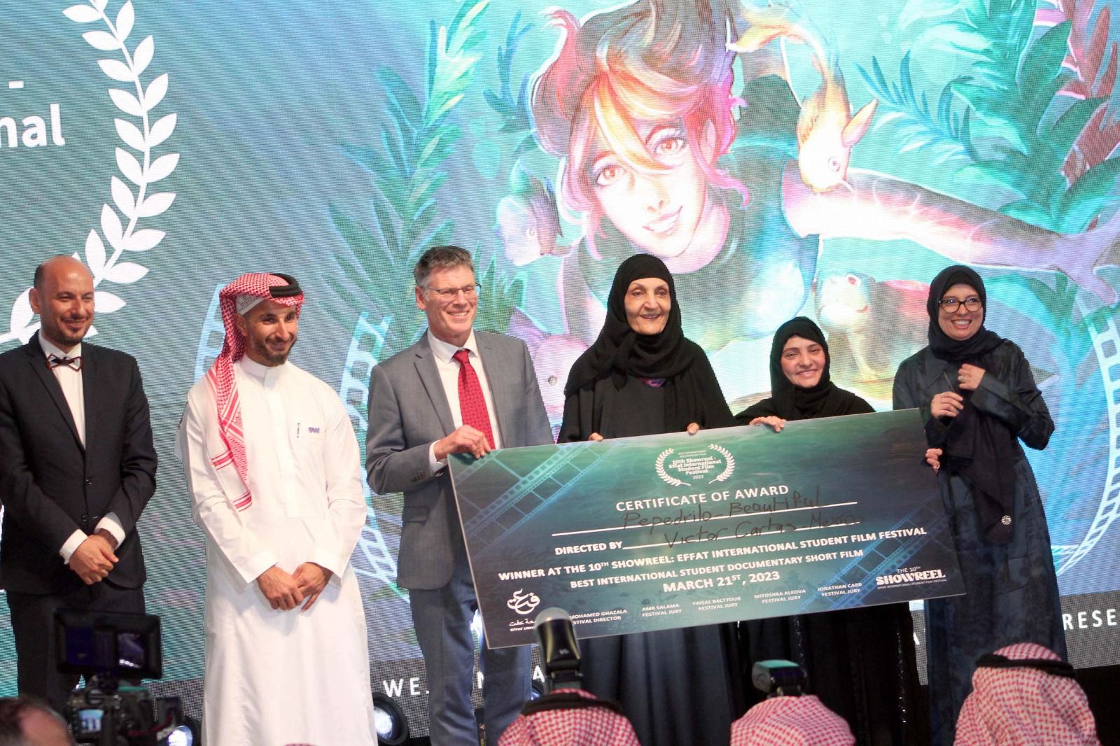 بحضور ورعاية من صاحبة السمو الملكي الأميرة لولوة الفيصل (نائب رئيس مجلس الأمناء والمشرف العام على جامعة “عفت”) أقامت جامعة “عفت” بجدة مساء أمس (الثلاثاء 21 مارس 2023م) الحفل الختامي لمهرجان “عفت” لأفلام الطلبة الدولي في دورته العاشرة للمهرجان تحت شعار “بحر من الأفلام” الحفل الختامي قاعة “عفت” الرئیسیة بالجامعة، بحضور الدكتورة هيفاء جمل الليل رئيسة الجامعة، ود. ميرفت شومان وكيلة الجامعة للشؤون الأكاديمية، و د. أسماء إبراهيم عميدة كلية العمارة بالجامعة، ود. محمد غزالة رئيس مدرسة السينما بالجامعة، وحضور المخرجات الشابات، وحشد كبير جداً من طالبات وطلّاب جامعة “عفت” والمهتمين والمهتمات بصناعة السينما وشخصيات فنية عربية وأجنبية من المشاركين والمهتمين بالحركة السينمائية السعودية تحديداً والسينما الشبابية بشكل خاص، وكوكبة من النجوم وضيوف شرف المهرجان.