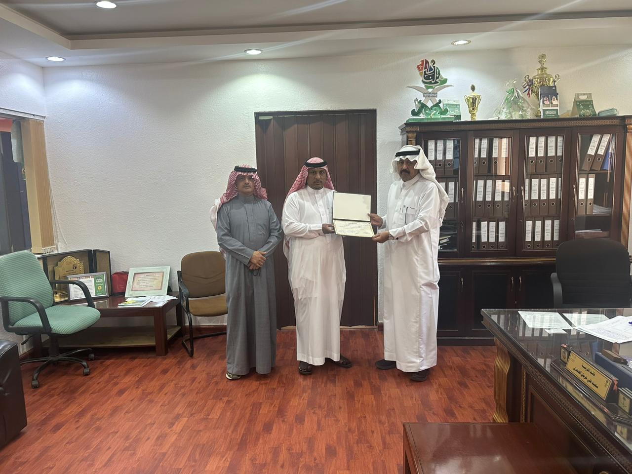 في موقف تربوي يتمثل في صورة من صور بر الوالدين أثناء زيارة الأخ نايف بن سعيد بن فالح لإدارة المدرسة وكان والده في المدرسة فقام بالسلام عليه وتقبيل رجله وهذا الموقف التربوي يستحق التقدير حيث قامت إدارة المدرسة بمنحه شهادة شكر وتقدير لهذا الموقف قدم شهادة الشكر والتقدير مدير المدرسة الاستاذ سعيد بن علي بن حريش الهاجري وشارك في التكريم الاستاذ خالد بن ناصر آل خرصان وكيل المدرسة للشؤون التعليمية والأستاذ معدي حسين على آل حيه الموجه الطلابي بالمدرسة ومجموعة من أعضاء هيئة التدريس بالمدرسة وشكر الأخ نايف بن سعيد بن فالح إدارة المدرسة على هذا التكريم وصلى الله وسلم على نبينا محمد وعلى آله وصحبه أجمعين