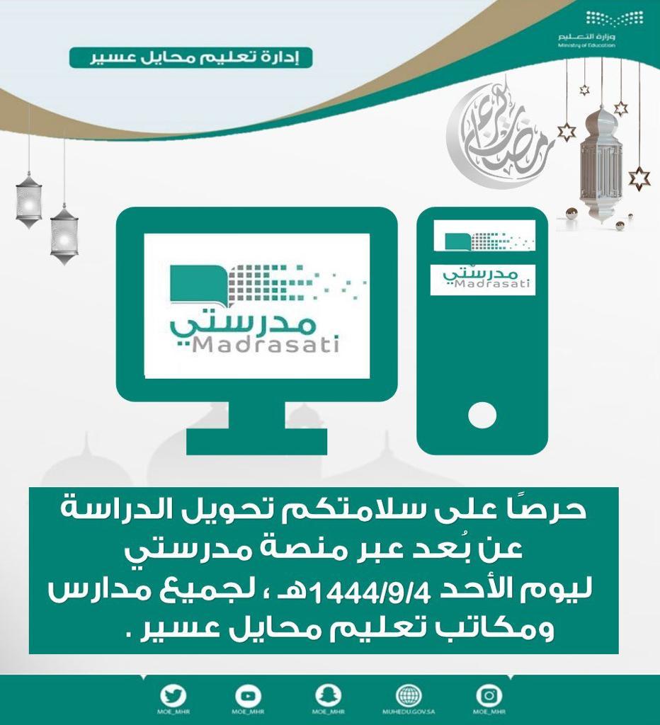 بناءً على التقارير الواردة من المركز الوطني للأرصاد وحرصآعلى سلامة الجميع فقد تقرر التحويل إلى الدراسة عن بعد ليوم غدآ الأحد الموافق 4/ 9/ 1444.وسيكون الدوام عبر منصة مدرستي لجميع الطلبه والطالبات ومنسوبي ومنسوبات المدارس في مكاتب التعليم بالمحافظات “محايل- بارق- المجاردة”