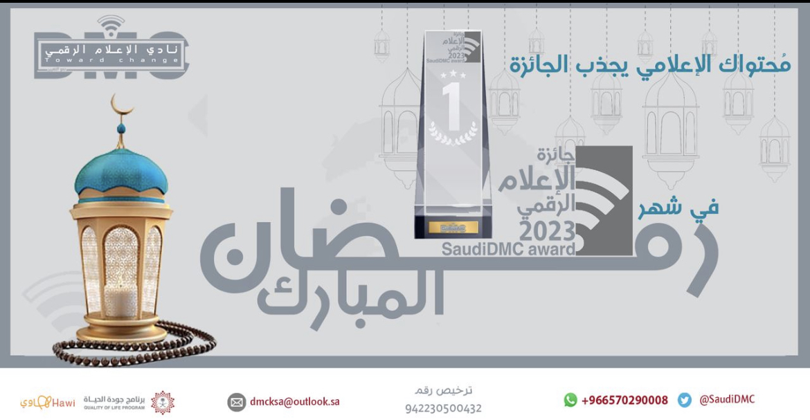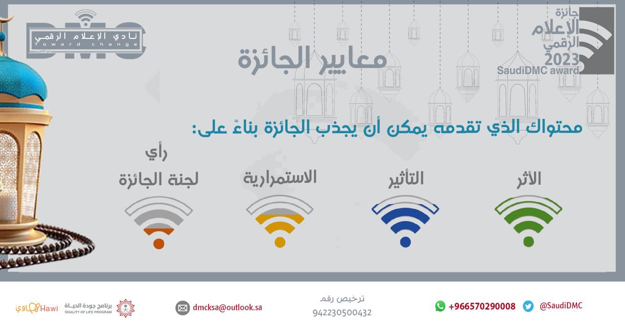 أعلِنَ عن إطلاق جائزة الإعلام الرقمي ٢٠٢٣ SaudiDMC Award والتي ينظمها نادي الإعلام الرقمي النادي المعتمد والمرخص من برنامج جودة الحياة إحدى برامج رؤية المملكة ٢٠٣٠ بإشراف وذلك باعتماد وزارة الإعلام