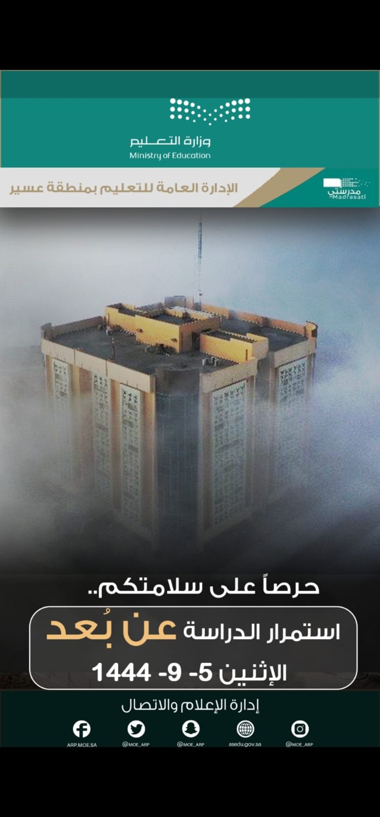 بناءً على التقارير الواردة من المركز الوطني للأرصاد وحرصآعلى سلامة ابنائنا الطلاب فقد تقرر تحويل الدراسة عن بعد ليوم غدآ الأثنين الموافق ٥ رمضان ١٤٤٤ للهجرة وسيكون الدوام عبر منصة مدرستي لجميع الطلبه والطالبات ومنسوبي ومنسوبات المدارس في إدارة التعليم ومكاتب التعليم بمنطقة عسير نسأل الله تعالى لأبنائنا الطلاب التوفيق والنجاح وصلى الله على نبينا محمد وعلى آله وصحبه أجمعين