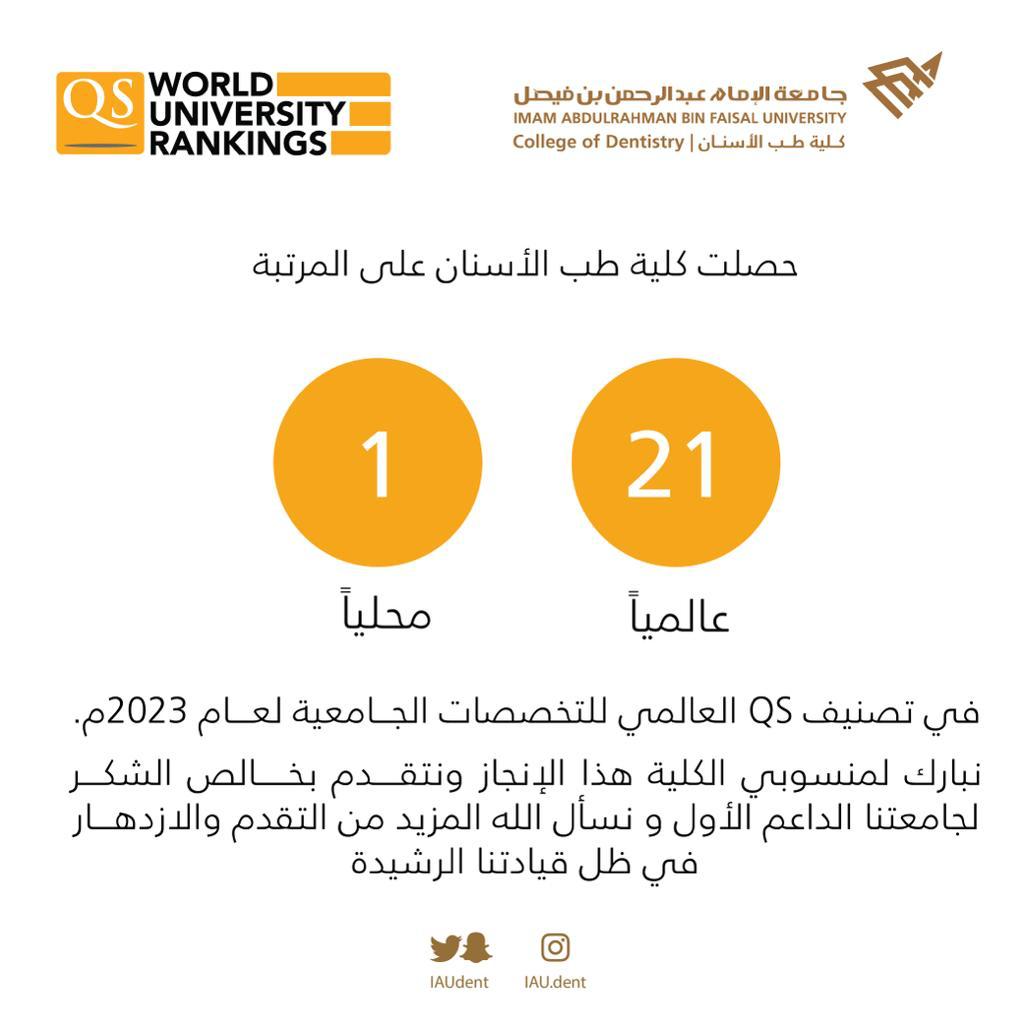 تصدرت كلية طب الاسنان بجامعة الامام عبدالرحمن بن فيصل مراتب متقدمة في نتائج تصنيف (QS) العالمي للتخصصات الجامعية 2023 م . حيث حققت الكلية المركز الأول على المستوى المحلي والمركز (21) على المستوى العالمي كأول كلية طب أسنان في المملكة تحصل على هذا التصنيف العالمي من افضل ٥٠ كلية بالعالم .