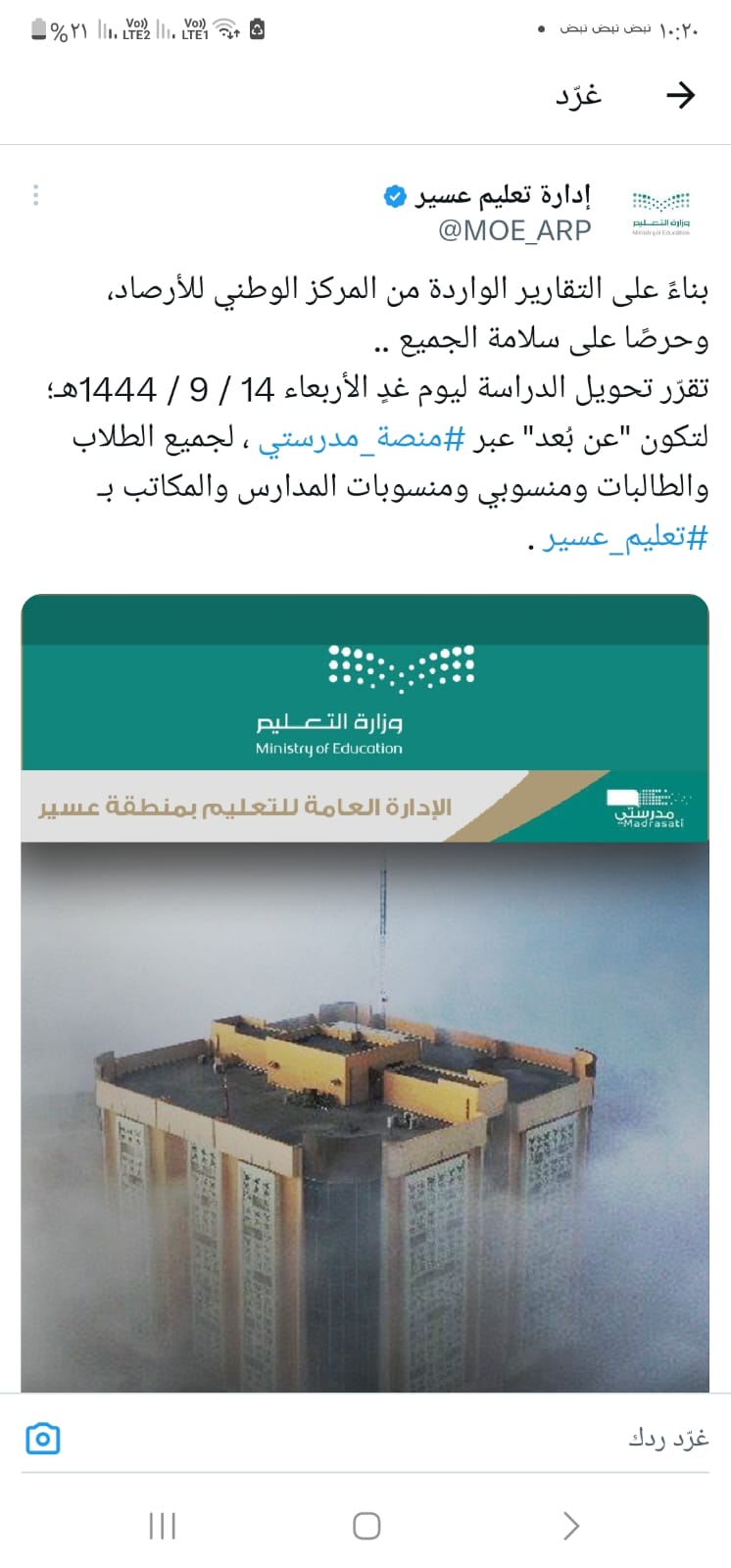 تم تعليق الدراسة الحضورية غداً الاربعاء ١٤ رمضان ١٤٤٤ للهجرة بتعليم عسير والمحافظات التابعة لها بسبب الأحوال الجوية حرصاً على سلامة أبنائنا الطلاب
