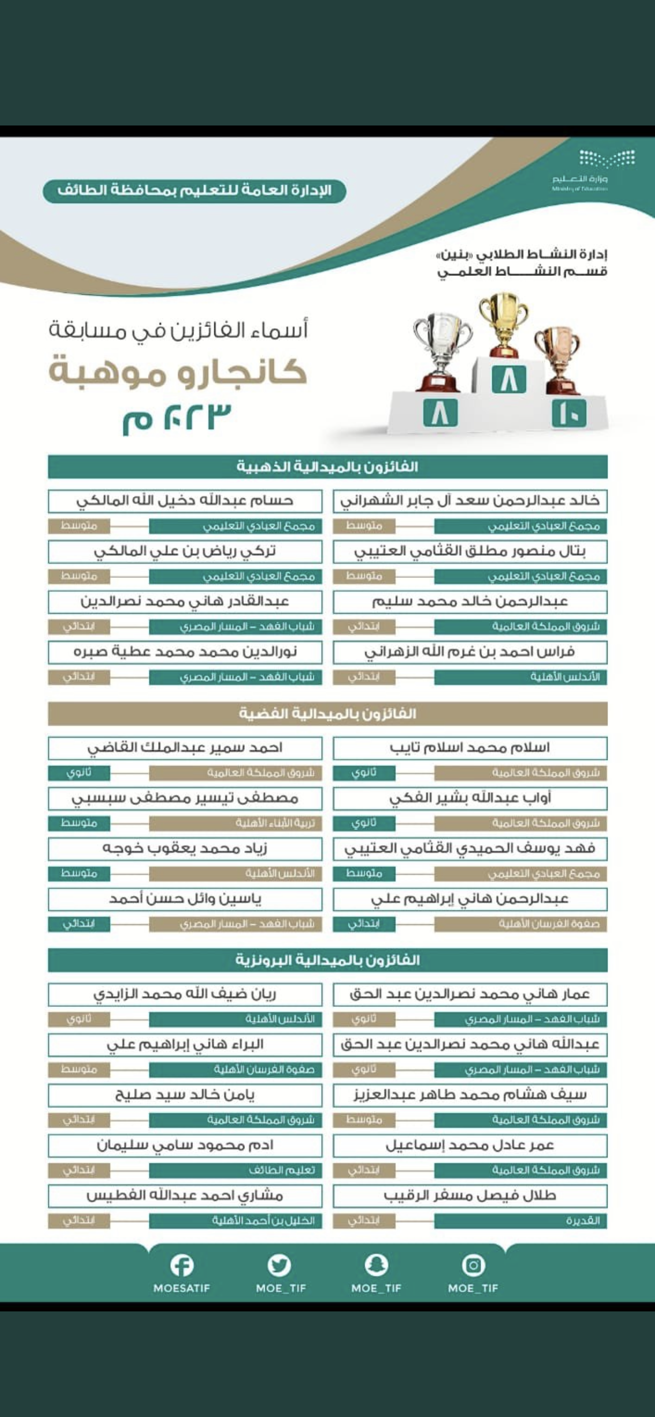 طلاب تعليم الطائف يحصدون ٢٦ ميدالية “ذهبية وفضية وبرونزية في مسابقة كانجارو 2023، ومدير عام التعليم يقدم التهنئة للطلاب وأسرهم ومدارسهم ولإدارة نشاط البنين “قسم النشاط العلمي” على هذا الإنجاز كما تهنئ صحيفة أحوال الإلكترونية جميع الطلاب وأسرهم على هذا الإنجاز المتميز وتتمنى لهم دوام التوفيق والتميز والإبداع و تعد مسابقة كانجارو موهبة للرياضيات من أكبر المسابقات التي تقام في أكثر من 70 دولة حول العالم لقرابة 6 ملايين طالب، تستهدف المسابقة الطلبة من الصف الثالث الابتدائي إلى الثالث ثانوي.