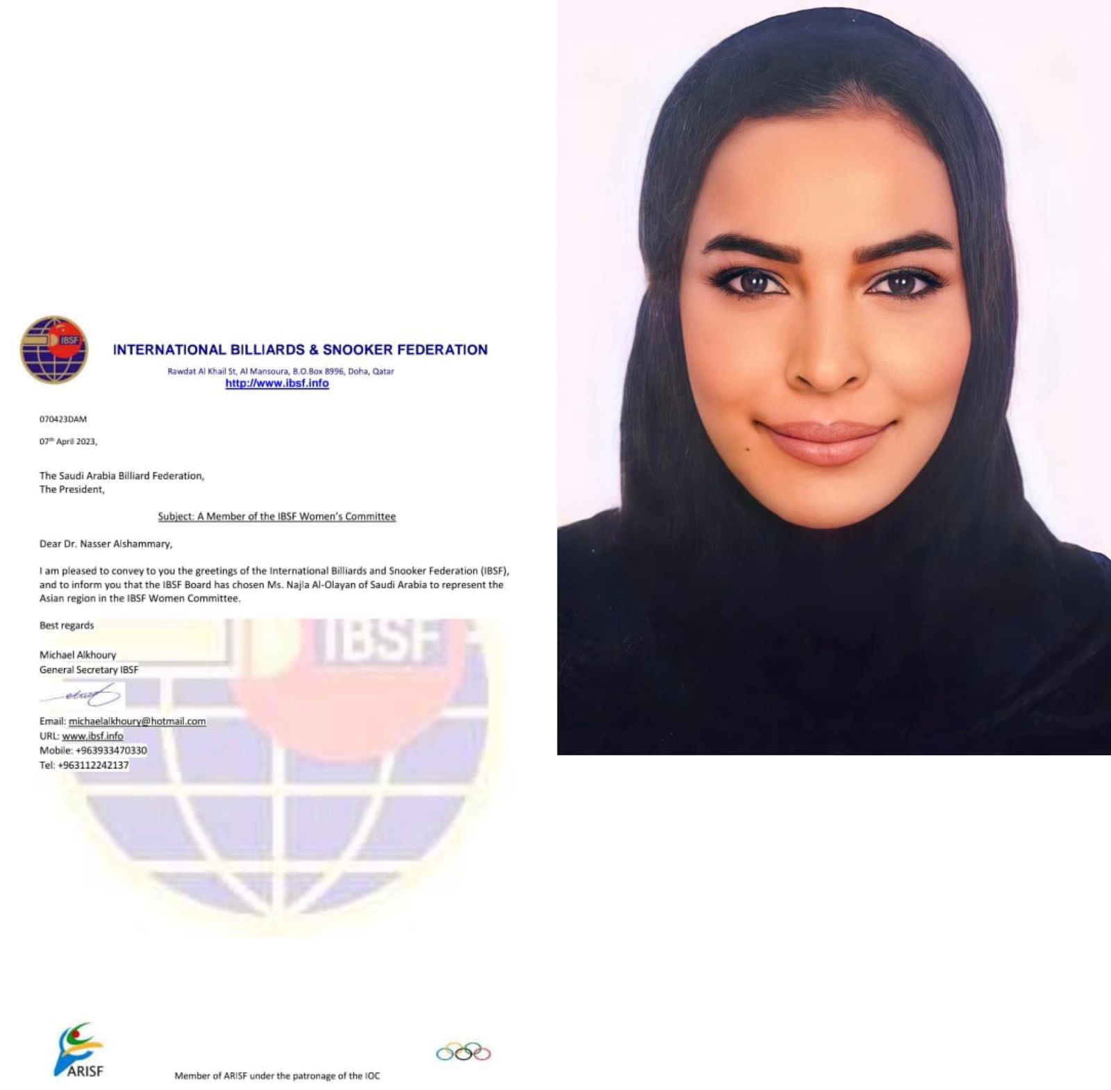 عين الاتحاد الدولي للبلياردو والسنوكر اليوم الجمعة السعودية نجلاء العليان نائبة رئيس الاتحاد السعودي للبلياردو والسنوكر كعضوه وممثله عن القارة الآسيوية في لجنة المرأة بالاتحاد الدولي “IBSF”.