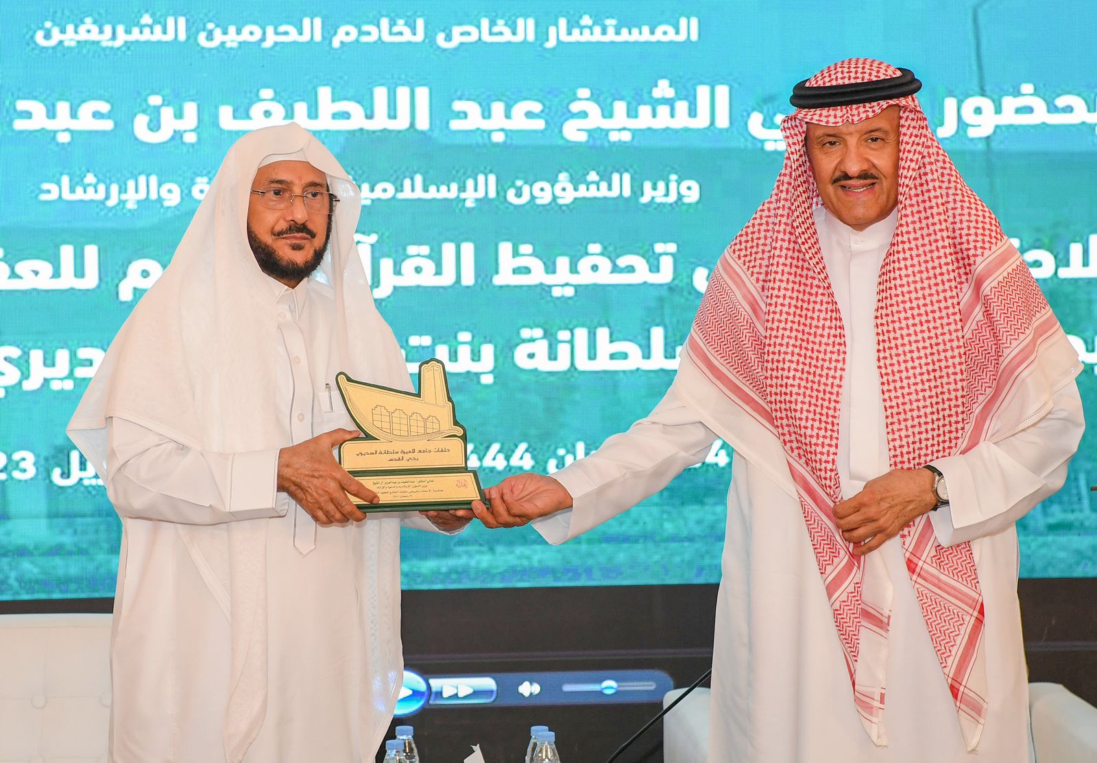رعى مستشار خادم الحرمين الشريفين سمو الأمير سلطان بن سلمان وبحضور معالي وزير الشؤون الإسلامية والدعوة والإرشاد الشيخ الدكتور عبداللطيف بن عبدالعزيز آل الشيخ حفل تكريم خريجي حلقات تحفيظ القرآن الكريم وتميزوا علميا وفي مسيرتهم المهنية بجامع الأميرة سلطانة بنت تركي السديري رحمها الله بحي القدس بمدينة الرياض الذي أقيم مساء امس السبت الرابع والعشرين من شهر رمضان المبارك لعام 1444هـ، وشهده عدد من أصحاب السعادة والفضيلة وجمع غفير من المصلين .