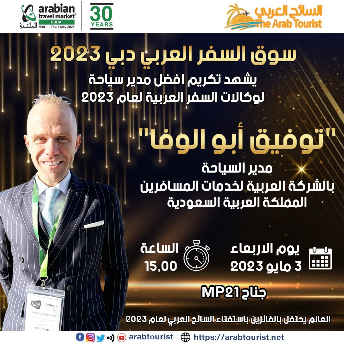 يشهد سوق السفر العربي 2023 والذي سوف ينطلق يوم الأثنين المقبل بإمارة دبي في دولة الإمارات، تكريم أفضل مدير سياحة لوكالات السفر العربية لعام 2023 السيد / توفيق أبو الوفا مدير السياحة والشركة العربية في خدمة المسافرين في المملكة العربية السعودية، وذلك يوم الأربعاء الموافق 3 مايو 2023 عند الساعة 3:00 عصرا في جناح 21 MP.