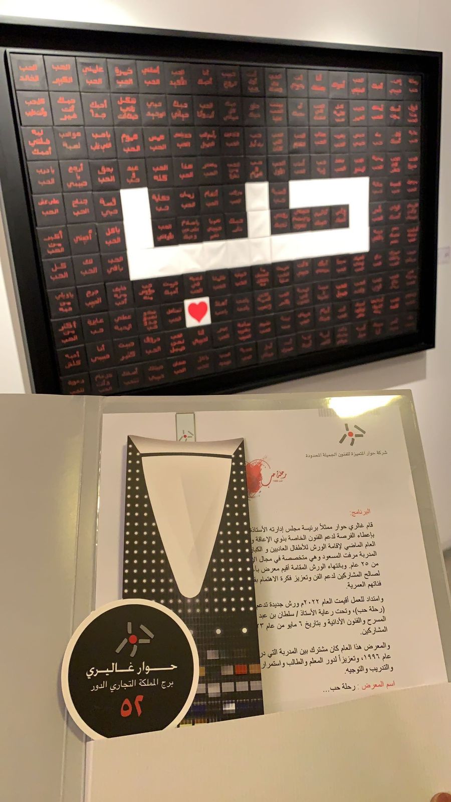 في مركز جاليري حوار ببرج المملكة الدور ( ٥٢ ) مساء يوم السبت الماضي 6 مايو ويستمر حتى ٢٠ مايو ، المعرض الفني ( رحلة حب ) لمجموعة من بعض الاطفال العاديين و من أطفال وشباب من ذوي متلازمة داون والتوحد ، بإشراف الأستاذة : ميرفت المسعود والأستاذة : نوف الحرقان ، وبمشاركة كلاً من : ريما الطاسان ، صبا الصالح ، سلمى الهاشم ، صيته الصالح ، مشعل الطاسان ، أحمد خوجة ، عبدالعزيز التويجري ، أحمد المزروع ، لما العمر ، عبدالله المناور ، صفية الهاشم .
