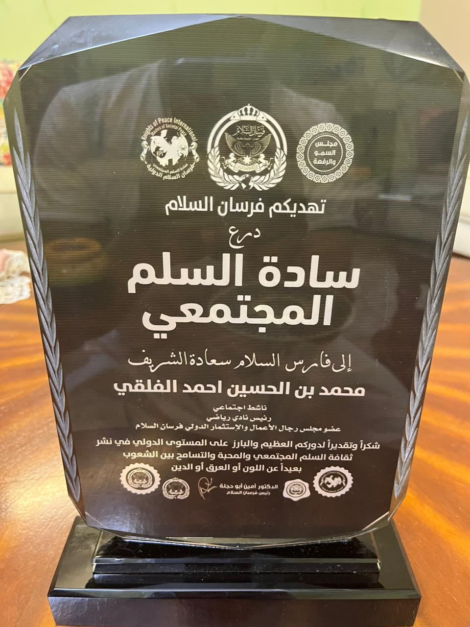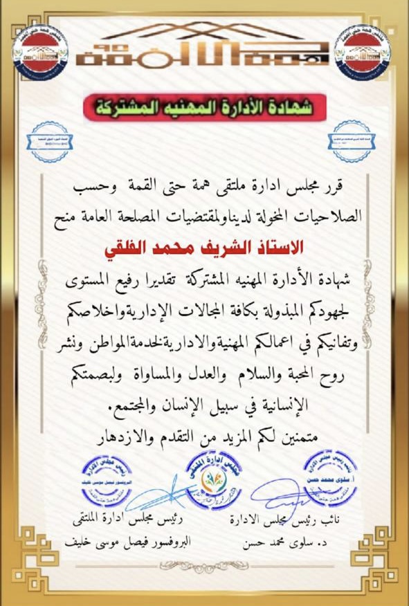 كرمت إدارة مجلس همة حتى القمة يوم أمس الأربعاء الموافق 20 – شوال- من عام 1444- الاستاذ ، الشريف محمد الفلقي وذلك بمنحة شهادة الإدارة المهنية المشتركة تقديراً لجهوده المبذولة في كافة المجالات التي ساهمت في نشر الحب والسلام بين الشعوب.
