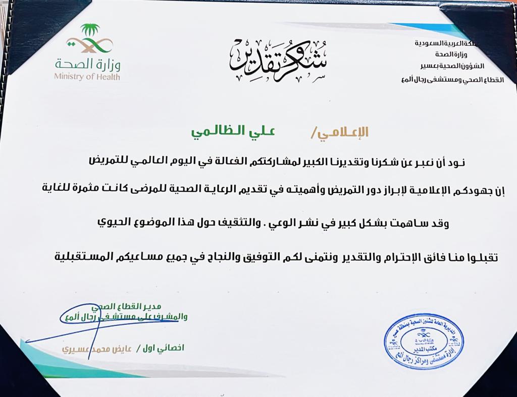كرّم مدير القطاع الصحي والمشرف على مستشفى رجال ألمع الأخصائي أول عايض محمد عسيري اليوم الأربعاء الإعلامي علي الظالمي وذلك نظير مايقوم به الظالمي من جهود متتالية في تغطيات فعاليات وأخبار القطاع الصحي برجال ألمع.