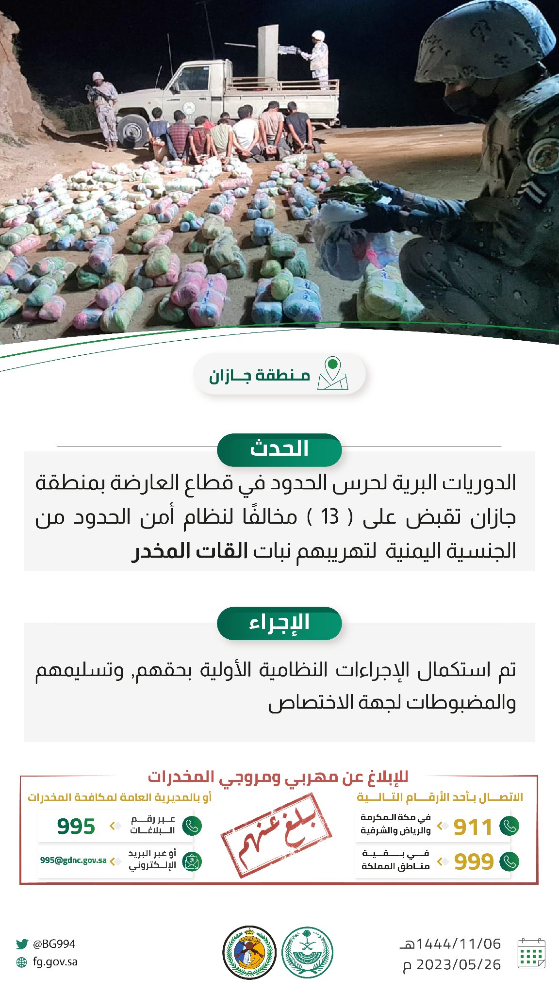 وتهيب الجهات الأمنية بالإبلاغ عن كل ما يتوافر من معلومات لدى المواطنين والمقيمين عن أي نشاطات ذات صلة بتهريب أو ترويج المخدرات، وذلك من خلال الاتصال بالأرقام (911) في مناطق مكة المكرمة والرياض والشرقية و(999) في بقية مناطق المملكة، ورقم بلاغات المديرية العامة لمكافحة المخدرات (995)، وعبر البريد الإلكتروني 995@gdnc.gov.sa، وستعالج جميع البلاغات بسرية تامة.