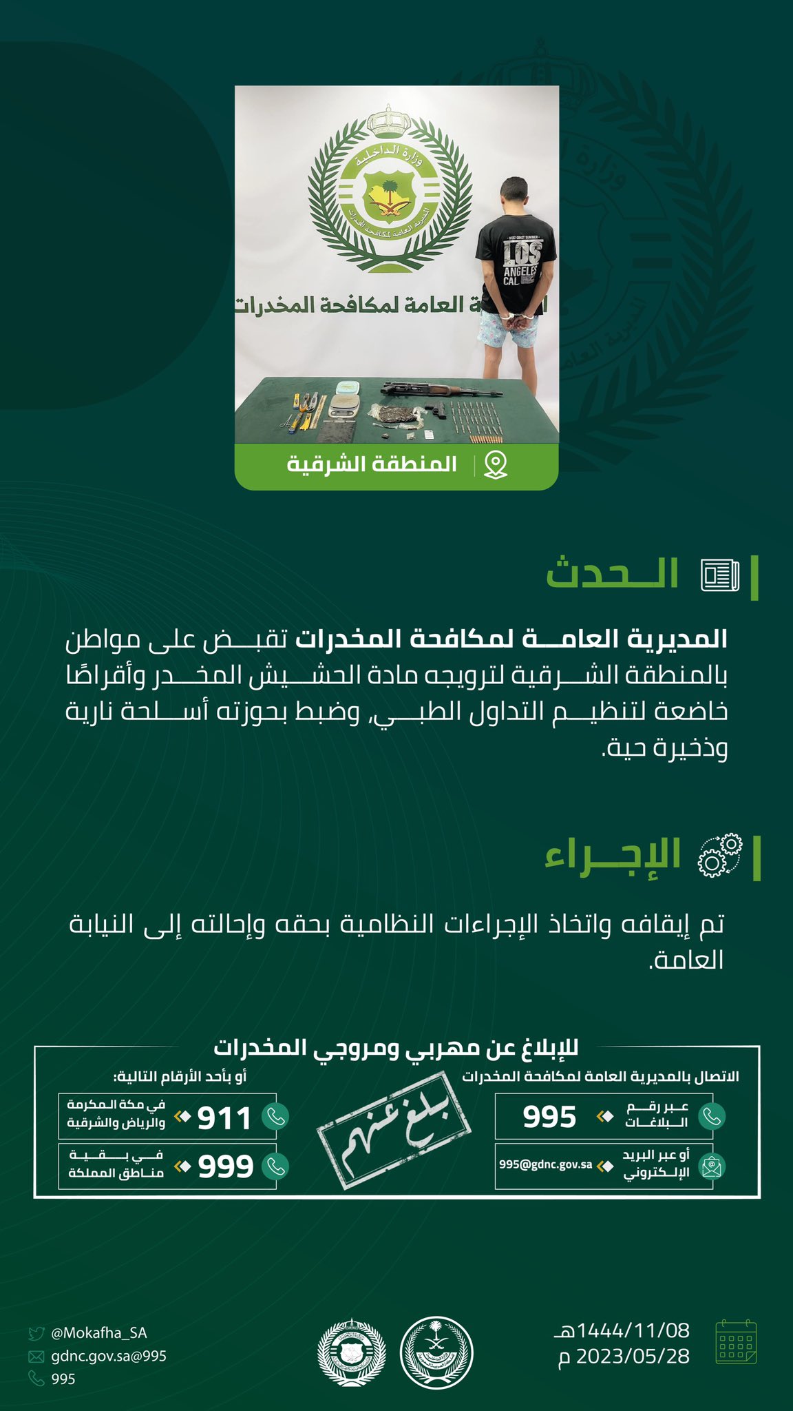 والجهات الأمنية تهيب بالإبلاغ عن كل ما يتوافر من معلومات لدى المواطنين والمقيمين عن أي نشاطات ذات صلة بتهريب أو ترويج المخدرات، وذلك من خلال الاتصال بالأرقام (911) في مناطق مكة المكرمة والرياض والشرقية و(999) في بقية مناطق المملكة، ورقم بلاغات المديرية العامة لمكافحة المخدرات (995)، وعبر البريد الإلكتروني 995@gdnc.gov.sa، وستعالج جميع البلاغات بسرية تامة.