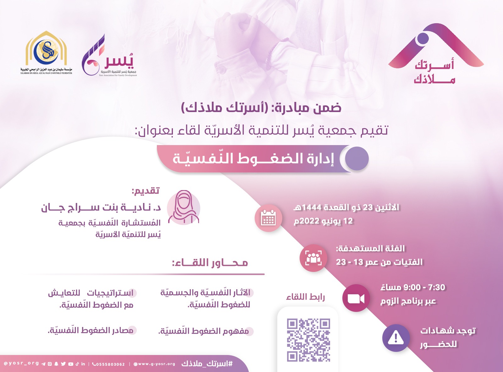 جمعية يسر للتنمية الأسرية بمكة تقيم مساء اليوم لقاء بعنوان: ( إدارة الضغوط النفسية)
