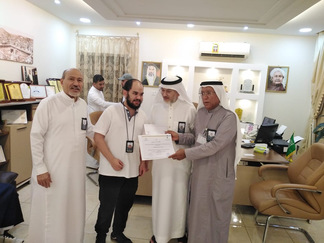 والدكتور عمار أسامة علاء الدين – مشرف خدمات الإستقبال والجوازات – والأستاذ عبدالله عزيزالرحمن – بإقامة حفل لتكريم الأعضاء المميزين بالمركر لجهودهم خلال الفترة الماضية في خدمة وراحة ضيوف الرحمن منذ لحظة وصولهم مكة المكرمة وإستقبالهم في العمائر السكنية المعدة لهم وتقديم الضيافة لهم بالإضافة للوجبات الساخنة – وبعدها أخذهم للمسجد الحرام للتطويف