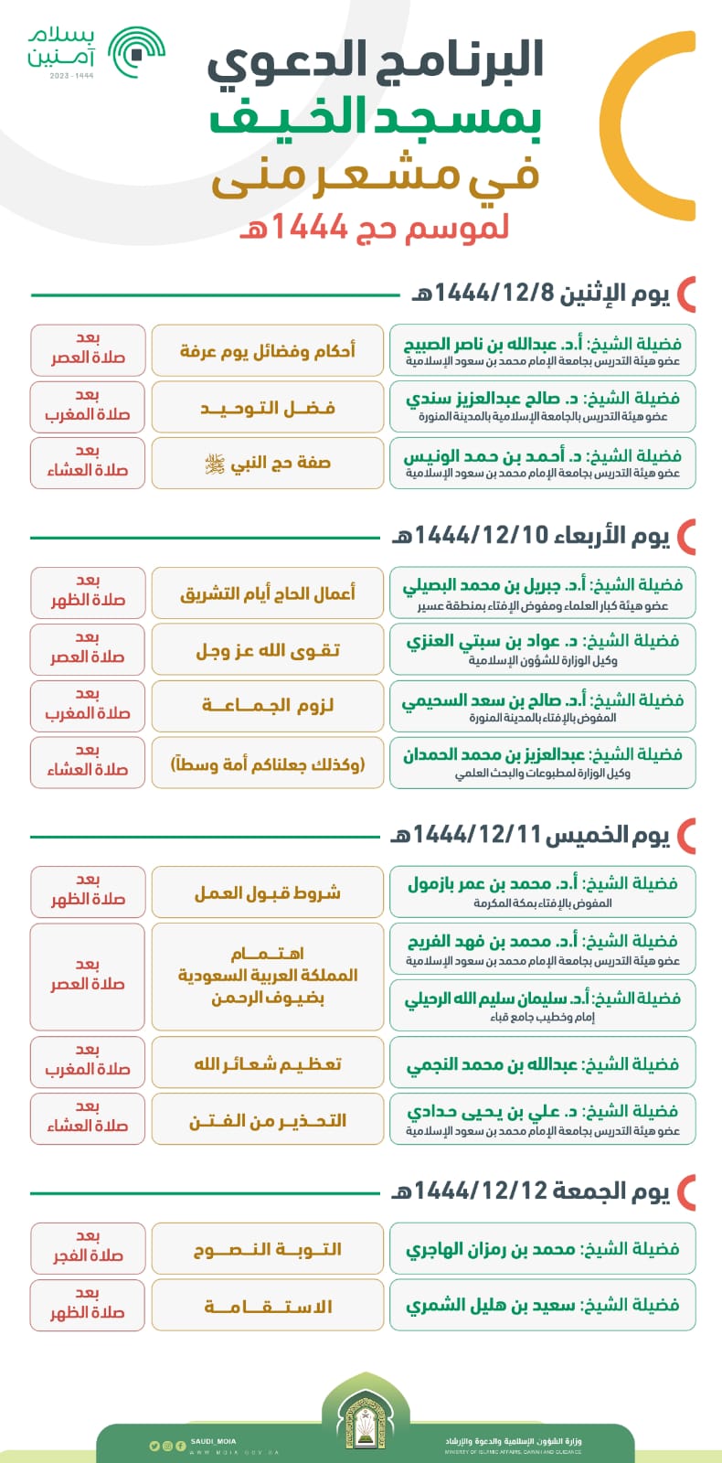 تقيم وزارة الشؤون الإسلامية والدعوة والإرشاد، ممثلة بالأمانة العامة للتوعية الإسلامية في الحج والعمرة والزيارة، برنامجاً دعوياً يتمثل في إقامة المحاضرات الدعوية بمسجد الخيف في مشعر منى، اعتباراً من اليوم الثامن وحتى الثاني عشر من شهر ذي الحجة 1444هـ، وذلك ضمن برامجها الدعوية خلال موسم الحج لهذا العام، ويأتي ذلك بمتابعة وتوجيهات معالي الوزير الشيخ الدكتور عبداللطيف بن عبدالعزيز آل الشيخ تماشياً مع رسالة المملكة السامية في نشر الوسطية والاعتدال، وتوجيه ضيوف الرحمن وفق المنهج الصحيح الذي جاء به الكتاب والسنة النبوية المطهرة.
